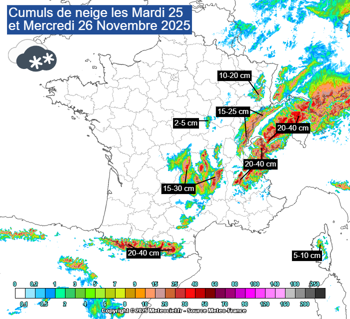 Cumuls de neige prévus ces mardi 25 et mercredi 26 novembre 2025 – meteociel.fr