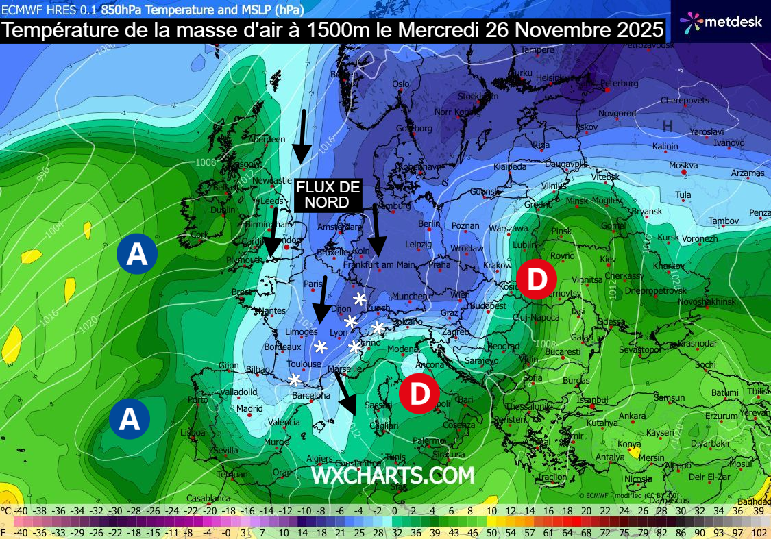 Masse d’air vers 1500m ce mercredi 26 novembre 2025 – wxcharts.com