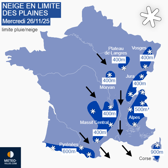 La limite pluie/neige s’abaisse déjà en basse montagne ce mardi 25 novembre 2025 et continuera de descendre jusqu’à ce mercredi 26 novembre 2025. Elle se situera alors aux alentours de 400 mètres seulement entre les Vosges, le Jura et le Massif Central, concernant aussi le Morvan et le plateau de Langres. Dans le nord des Alpes, la neige tombera à partir de 500 mètres et dès 600 mètres dans les Pyrénées. Le relief corse ne sera pas épargné avec des averses de neige dès 900 mètres.