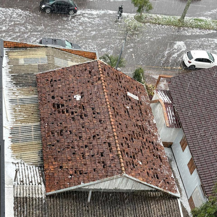 Toiture endommagée par la grêle à Erechim (Brésil) le dimanche 23 novembre 2025 – via Geração FM