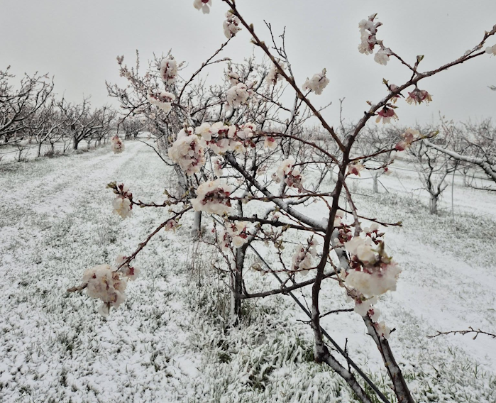 Abricotiers en fleurs sous la neige à Martigny (Suisse) à 400 mètres d’altitude ce jeudi 26 mars 2026 – photo Georges Delaloye