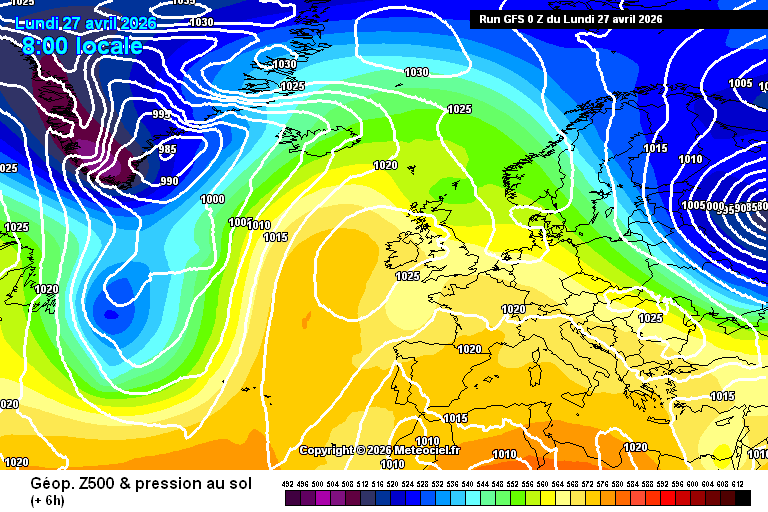 Animation des géopotentiels sur l’Europe du 27 au 30 avril 2026 – Modèle GFS via meteociel