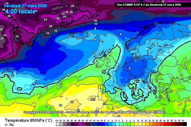 Animation des températures à 850 hPa sur l’Europe du 27 mars au 3 avril – Modèle ECMWF via meteociel