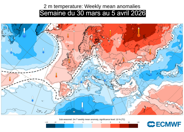 Anomalies de températures à 2m pour la semaine du 30 mars au 5 avril 2026 – ECMWF