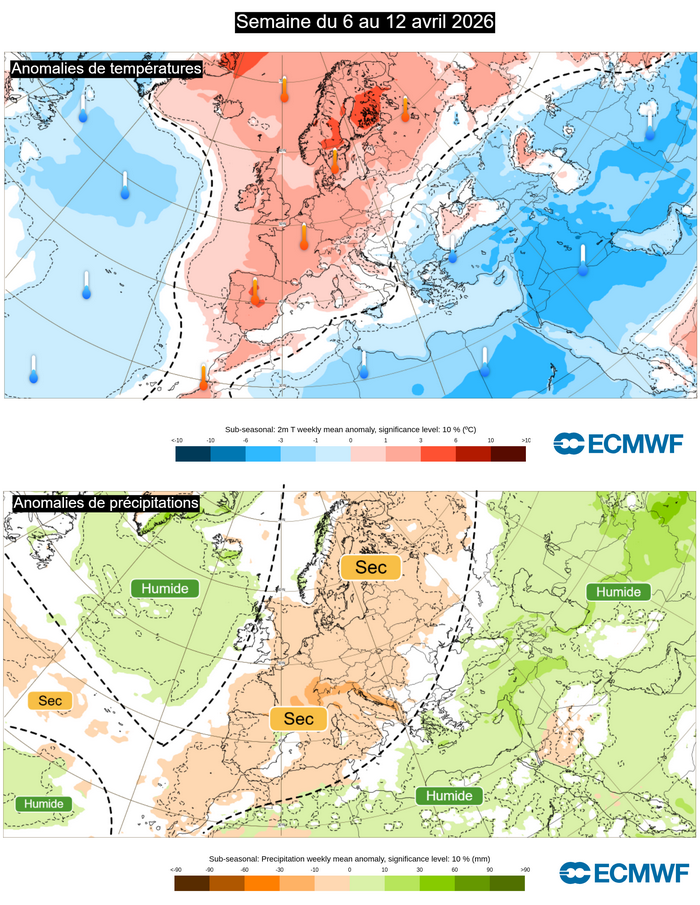 Anomalies de précipitations et de températures sur l’Europe pour la semaine du 6 au 12 avril 2026 – ECMWF