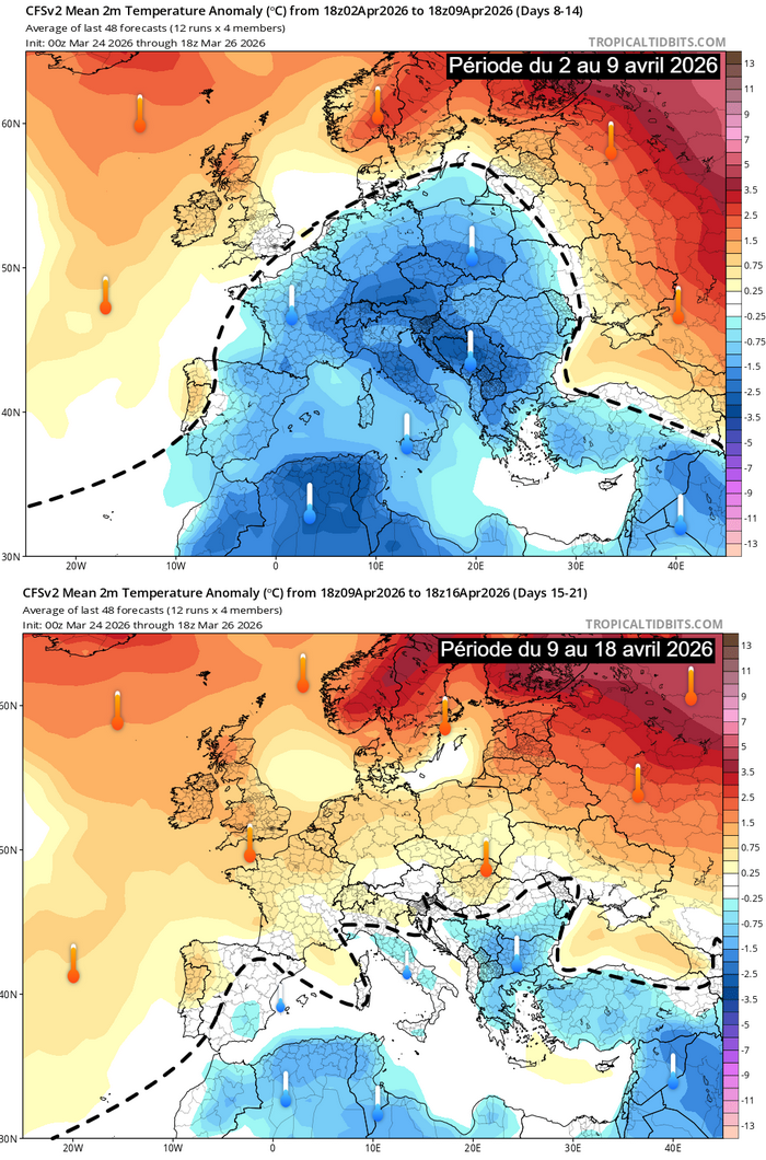 Anomalies de températures à 2m sur l’Europe du 2 a 16 avril 2026 – CFS