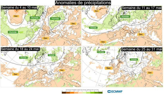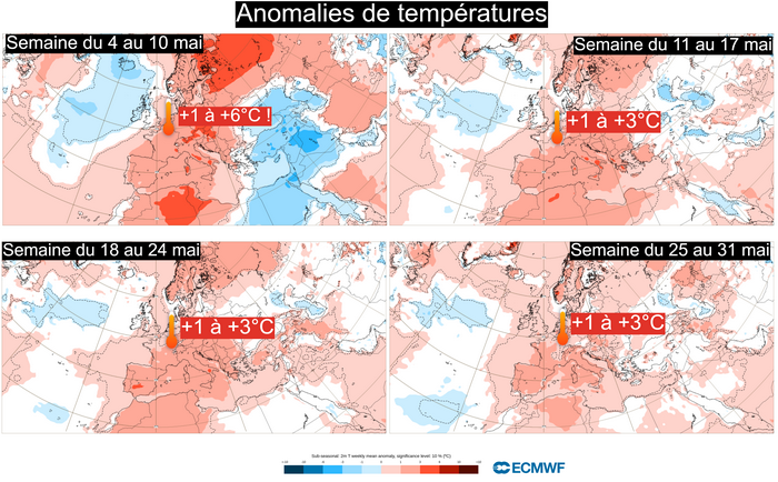 On comprend donc mieux pourquoi il est plus facile d’imaginer de véritables vagues de chaleur précoces à la fin du mois de mai avec des anomalies prévues de +1 à +3°C qu’au début du mois. Il conviendra néanmoins de confirmer cette tendance d’ici là.