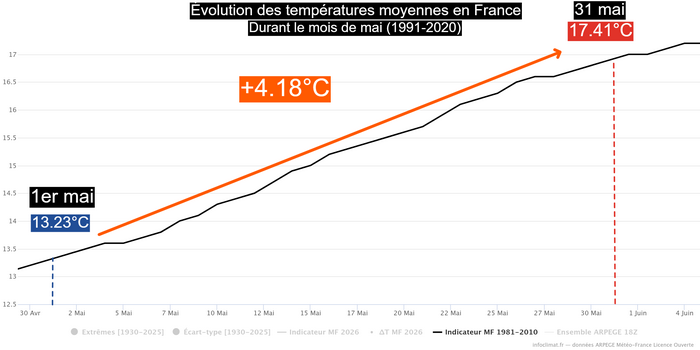 Évolution des températures moyennes en mai en France – Via infoclimat.fr
