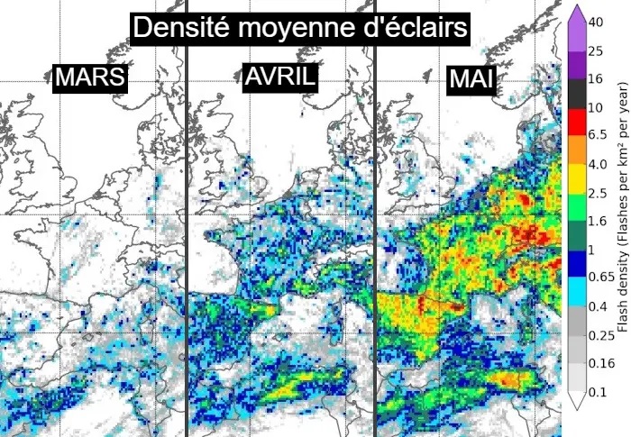 Densité moyenne d’éclairs au cours des mois de mars, avril et mai – Met-Office