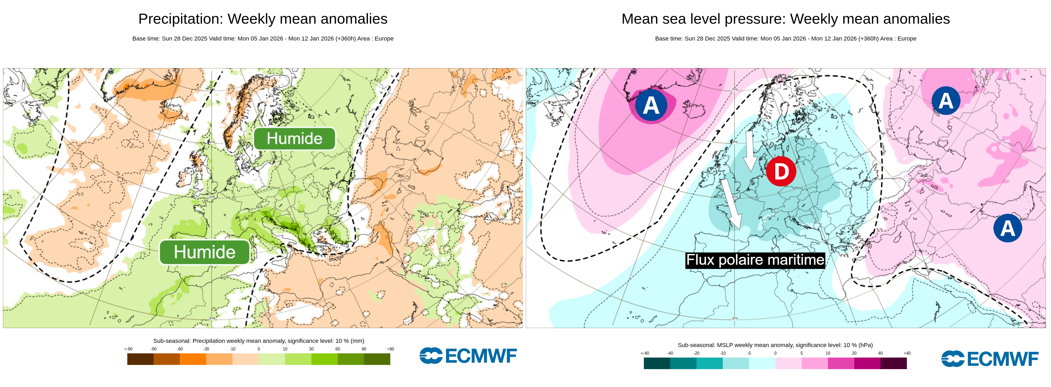 Anomalie de précipitations et de pressions pour la semaine du 5 au 11 janvier sur l’Europe – ECMWF