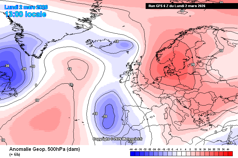 Anomalies de géopotentiels sur l’Europe du 2 au 8 mars 2026 – Modèle GFS via meteociel