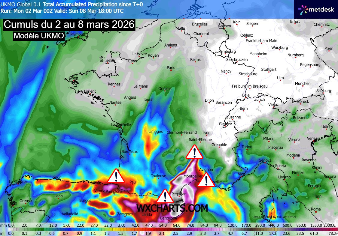 Cumuls de précipitations attendus d’ici le 8 mars 2026 sur la France – Modèle UKMO via WX CHARTS