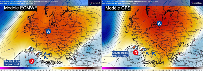 Néanmoins, ces hautes pressions accusent quelques faiblesses en ce début mars, permettant à une goutte froide de venir s’isoler sur la péninsule ibérique, apportant un temps plus perturbé en ce début de semaine sur ces régions.
