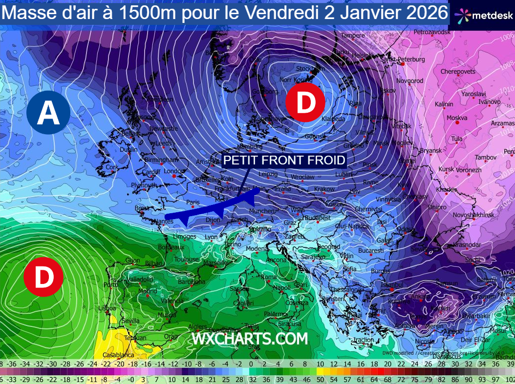 Une vaste dépression hivernale positionnée sur la Mer Baltique enverrait un nouvel afflux d’air froid sur le nord-est de la France ce vendredi 2 janvier 2026. Les températures à 850 hPa (vers 1500 mètres d’altitude) seront proches de -5 à -6°C vers le Grand-Est puis la Bourgogne-Franche-Comté, des niveaux suffisamment bas pour autoriser de la neige jusqu’aux plus basses altitudes. De plus, un petit front froid devrait se former au dessus de la Mer du Nord puis circuler sur le nord-est de l’hexagone.