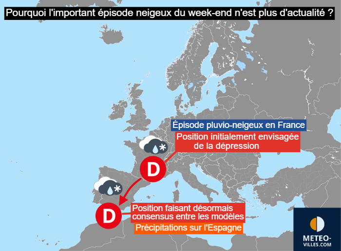 La cause de cette confusion ? Une dépression actuellement vers les Açores et qui devait se rapprocher de nos régions pour le premier week-end de l’année 2026. Jusqu’à hier, le scénario majoritaire voyait cette dépression atteindre le sud de la France, ce qui provoquerait un important conflit de masses d’air et un épisode pluvio-neigeux important sur le pays. Or, le scénario majoritaire voit désormais la dépression circuler vers Gibraltar, soit beaucoup plus loin. Par conséquent, le plus gros des précipitations resterait cantonné sur l’Espagne et un froid majoritairement sec dominerait en France.