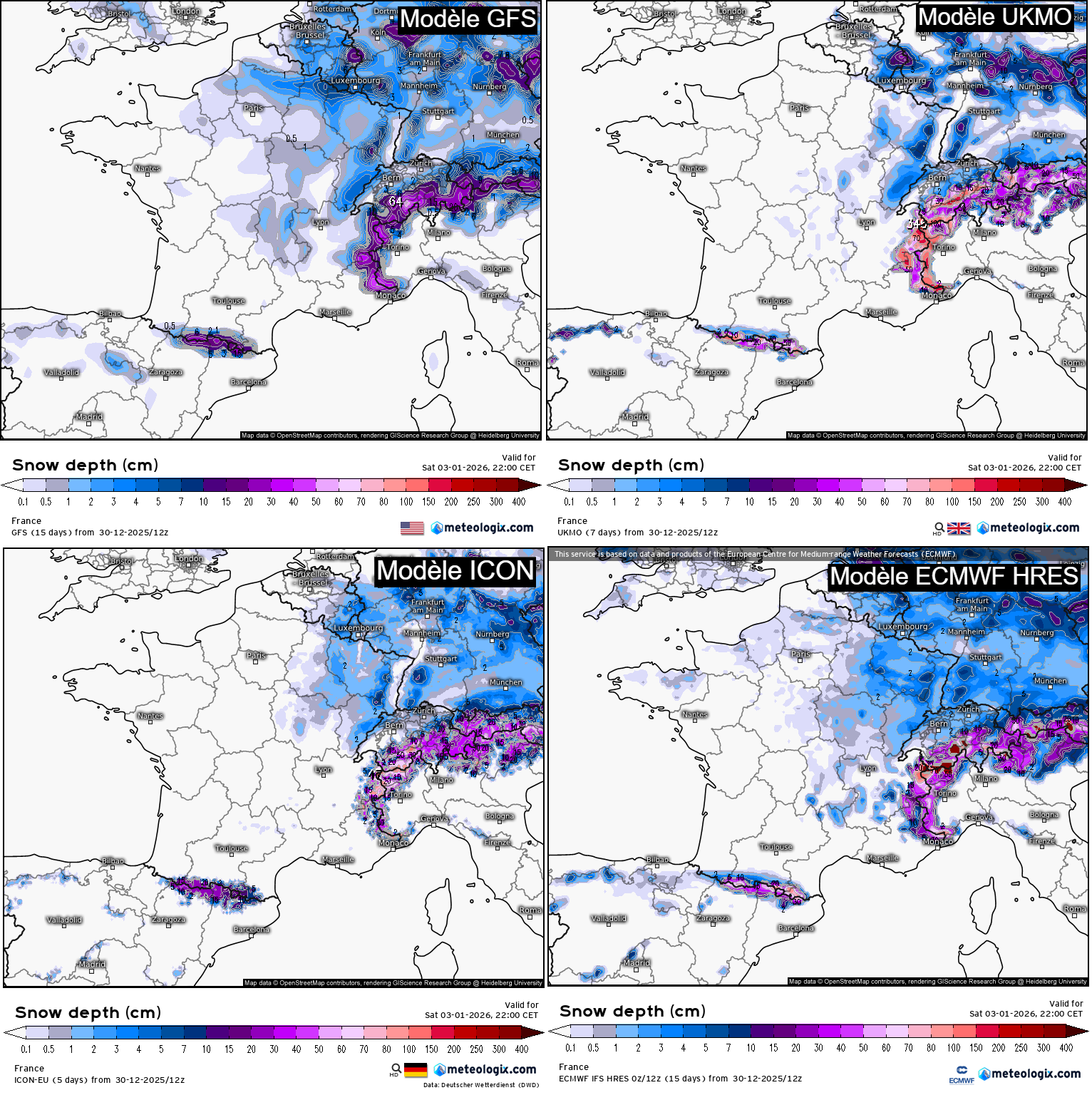 Différents scénarios de neige au sol pour le week-end des 3 et 4 janvier 2026, en date du 30 décembre 2025 – meteologix.com