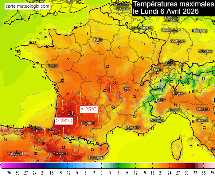 Températures maximales du lundi 6 avril 2026 selon le modèle allemand ICON du 31/03/26 – meteologix.com
