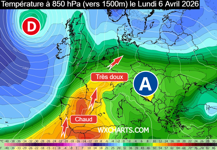 Masse d’air à 850 hPa (vers 1500m) pour le lundi 6 avril 2026 – wxcharts.com
