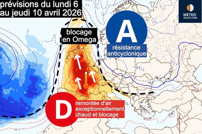 Un blocage oméga devrait concerner l’Europe de l’Ouest entre lundi 6 et jeudi 10 avril, affectant particulièrement la France ou les températures se rapprocheront des records. Meteo-villes.com