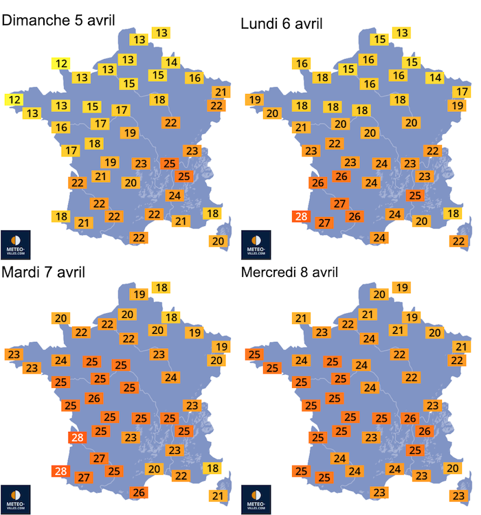 Carte des températures maximales prévues jusqu’à mercredi 8 avril 2026 par meteo-villes.com