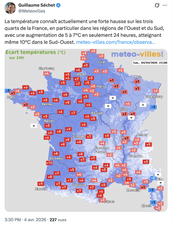 Carte de la hausse et température en 24 heures tweet sur notre compte X https://x.com/Meteovilles