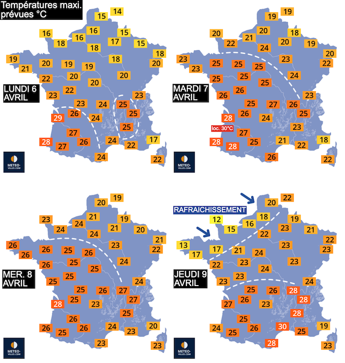 Températures maximales prévues entre lundi 6 et le jeudi 9 avril. Bulletin Meteo-villes.com