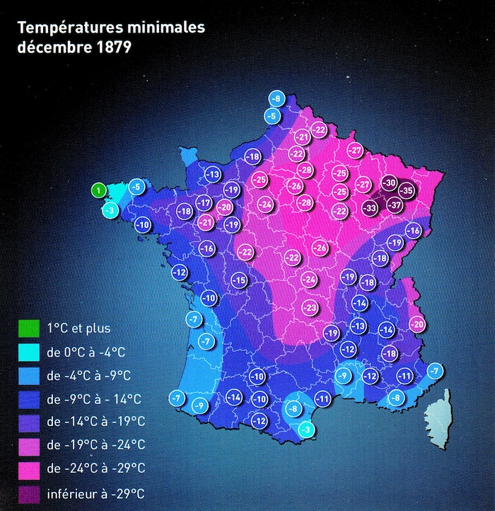 Températures minimales mesurées au cours du mois de décembre 1879Météo Villes, livre “Y’a plus de saison”