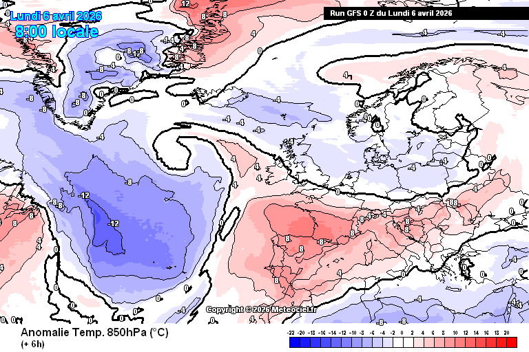 Animation des anomalies températures à 850 hPa sur l’Europe du 6 au 10 avril 2026 – Modèle GFS via meteociel