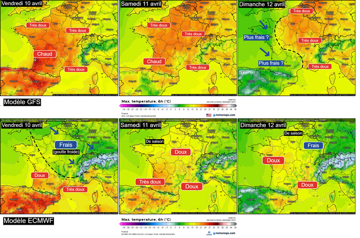 Comparaison de la situation prévue entre les modèles GFS et ECMWF pour le 10 avril 2026 – via WX CHARTS