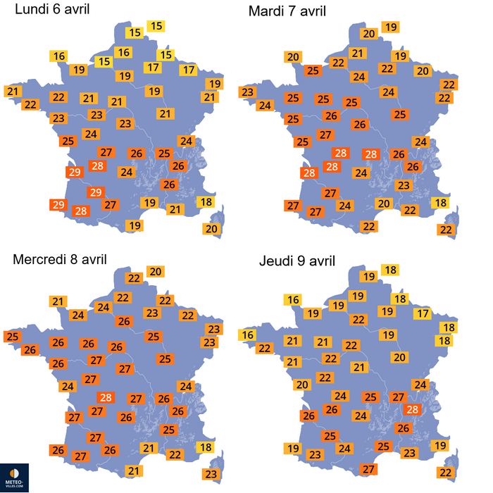 Températures maximales prévues sur la France du 6 au 9 avril 2026 – Météo-Villes