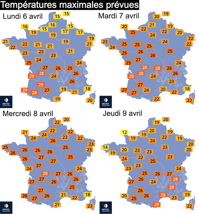 Température maximale prévue entre lundi et jeudi selon nos prévisions expertisées (prévisions météo en France réactualisées plusieurs fois par jour ici >>>)