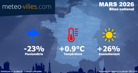 Les conditions ont été dans l’ensemble assez anticycloniques sur le pays au cours du mois de mars. Les 3/4 de la France n’ont pas atteint leur moyenne pluviométrique mensuelle, avec un déficit qui chute parfois sous les -50% en Alsace (-62% à Strasbourg et Colmar), en Bretagne (-53% à Rennes et -56% à Lorient), dans le Pas de Calais (-69% à Calais) ou encore de l’Aquitaine aux Alpes (-67% à Clermont-Ferrand,-59% à Agen, -55% à Bourg-Saint-Maurice). Ceci se traduit par des cumuls localement inférieurs à 30 voire 20mm (15mm à Strasbourg, 14mm à St-Etienne, 13mm à Calais). Le minimum national est de 8.6mm à Clermont-Ferrand.