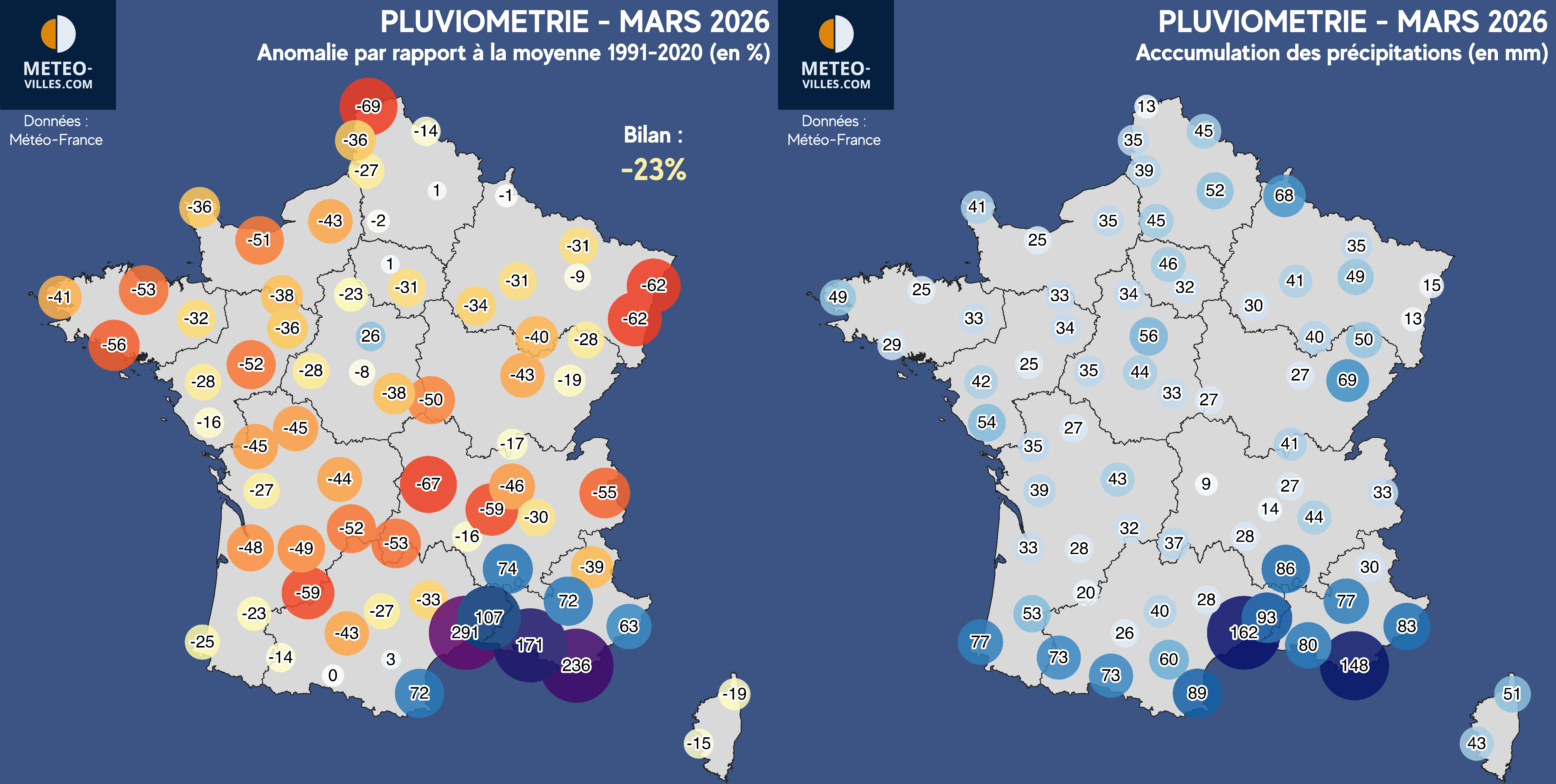 Le mois de mars a été relativement sec puisque le bilan fait état d’un déficit pluviométrique de -23%. Un mois qui contraste de manière saisissante avec février historiquement pluvieux (+115%).
