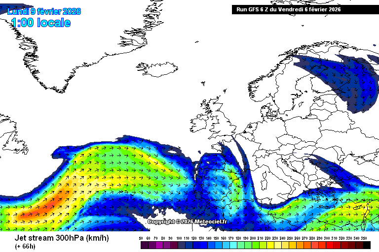 Animation du courant jet entre l’Atlantique et l’Europe du 8 au 14 février 2026 – Modèle GFS via meteociel.fr