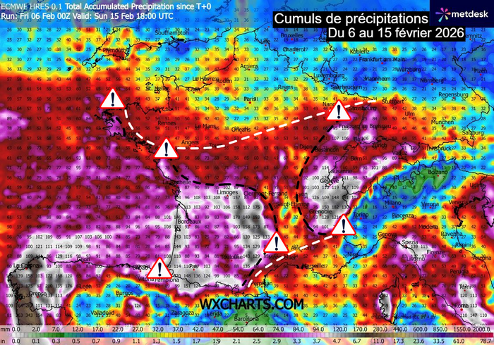 Cumuls de précipitations attendus du 6 au 15 février 2026 – Modèle ECMWF via WX CHARTS