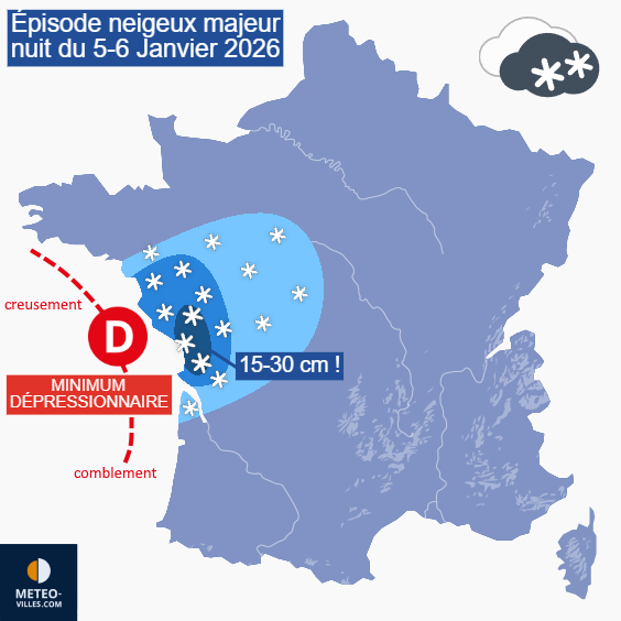 Si une grande partie nord-ouest de la France a été blanchie par la neige ce lundi 5 janvier 2026, les quantités ont été beaucoup plus importantes entre le sud des Pays de la Loire et la Charente-Maritime. En effet, un minimum dépressionnaire s’est creusé au sud de la Bretagne, causant le renforcement des précipitations sur la Loire-Atlantique (5 cm de neige à Nantes lundi soir) puis il a longé la Vendée et la Charente-Maritime dans la nuit. Son déplacement très lent a engendré des précipitations copieuses mais surtout durables, donnant 15 à 30 cm de neige entre sud-Vendée et Charente-Maritime !