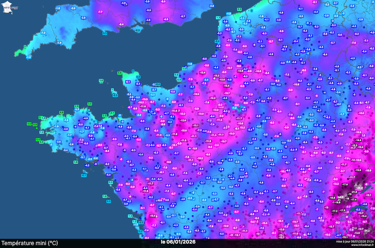 Températures minimales mesurées le 6 janvier 2025 – Infoclimat (cliquez sur la carte pour l’agrandir)