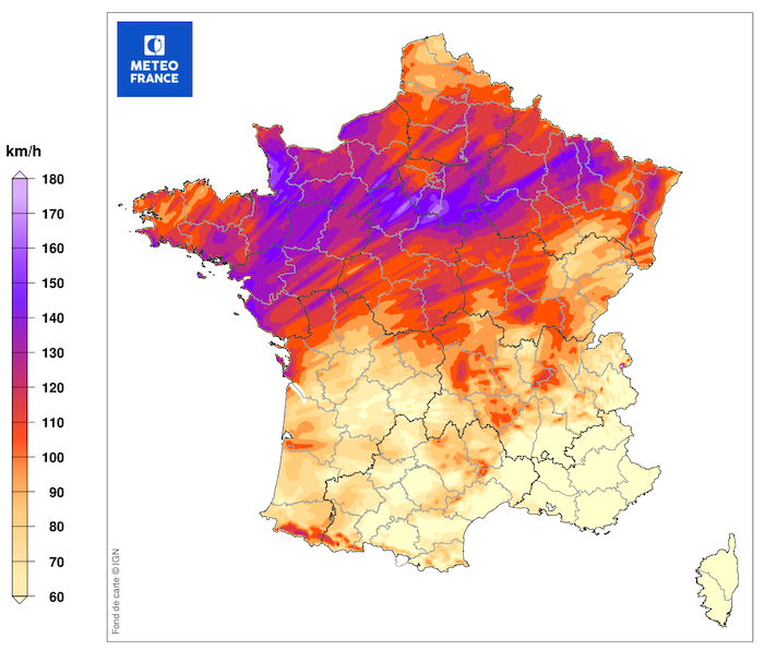Carte des rafales de vent maximales mesurées dans la journée du 3 février 1990 : le vent dépasse alors 130 km/h sur un axe allant des Pays de la Loire, à la Basse-Normandie, au sud de l’Île-de-France et à la Lorraine…