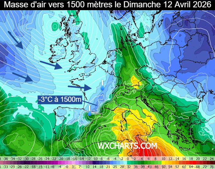 Après avoir enregistré des chaleurs records, la France se prépare à une chute vertigineuse des températures au cours de ce week-end des 11 et 12 avril 2026. Le flux basculera au secteur nord-ouest et amènera une masse d’air venue du nord de l’Atlantique. Ce dimanche 12 avril, la température de la masse d’air vers 1500 mètres passera sous le zéro sur une grande partie de la France et se situera aux alentours de -3°C entre les Pyrénées et le Massif Central.