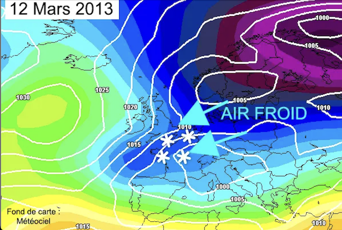 Le 10 mars 2013, un air froid venu de Scandinavie envahit le Benelux, les îles Britanniques et l’extrême nord de la France. Les températures chutent jusqu’en Île-de-France (1 °C à Lille, 5 °C à Paris). Ce froid contraste avec la douceur, parfois orageuse, qui domine sur le reste du pays.