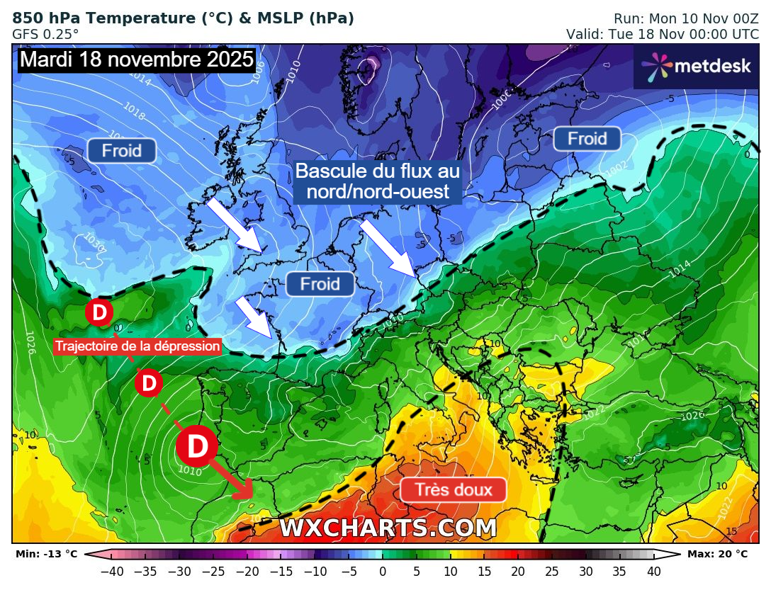 En effet, la situation va devenir favorable à un changement général de flux en Europe à partir du début de semaine prochaine. La zone dépressionnaire responsable du coup de douceur de cette semaine devrait en effet peu à peu plonger vers l’Afrique du nord et les régions méditerranéennes à partir du week-end, entraînant une bascule du flux en altitude et donc le retour d’un air plus froid et hivernal sur une large partie du continent.