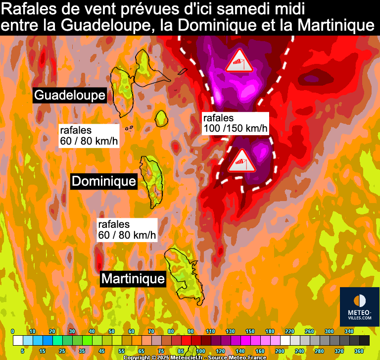 Au niveau du vent, les rafales les plus fortes resteront comme évoqué précédemment plus au large. On pourra tout de même atteindre 70-80km/h sur les reliefs et les littoraux, localement plus de 100-110km/h sur les secteurs exposés de l’est de la Guadeloupe. C’est d’ailleurs sur l’est de la Guadeloupe que la houle s’annonce la plus marquée.