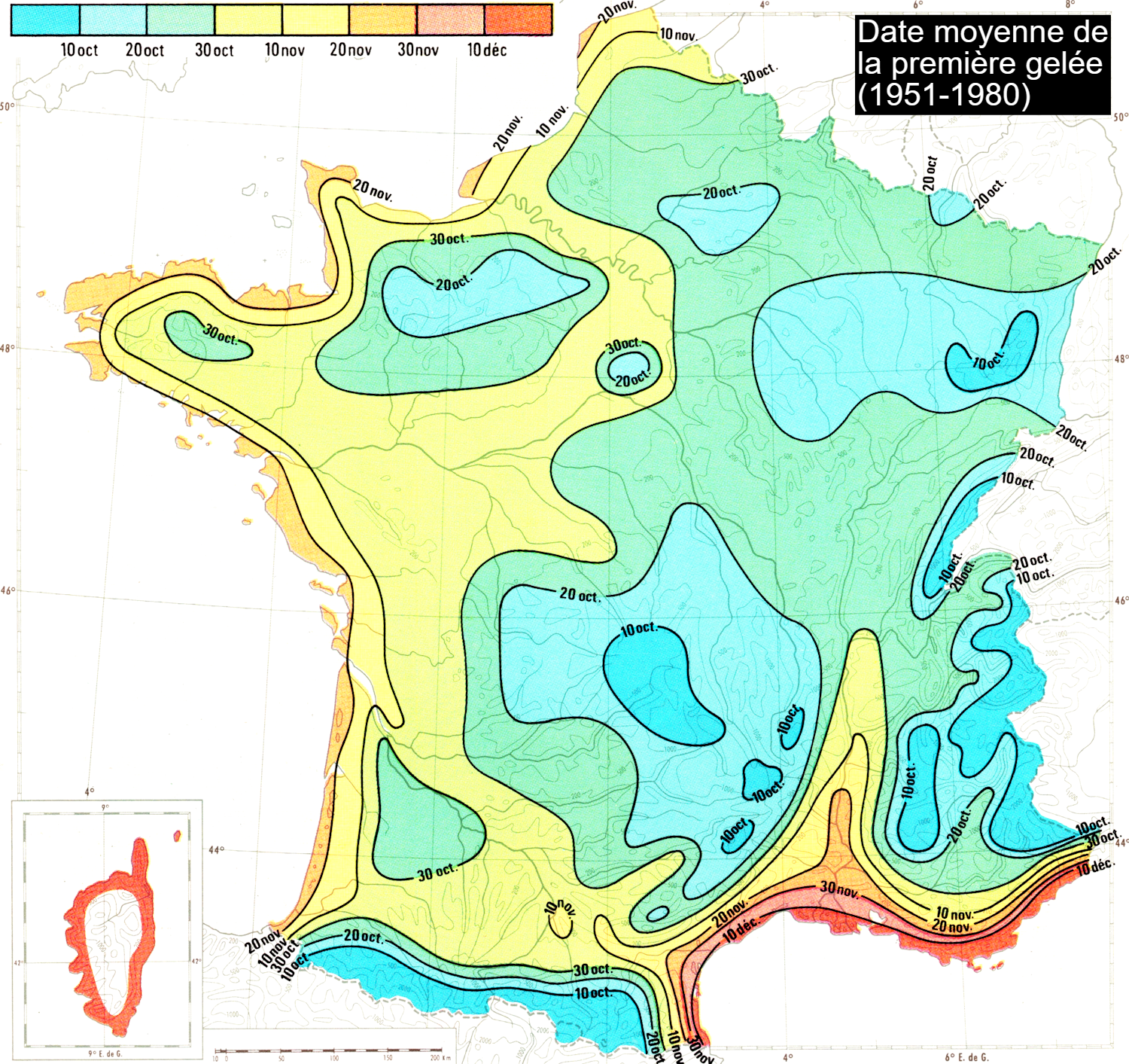 Date moyenne des premières gelées en France sur la base 1951-1980 – Météo Villes