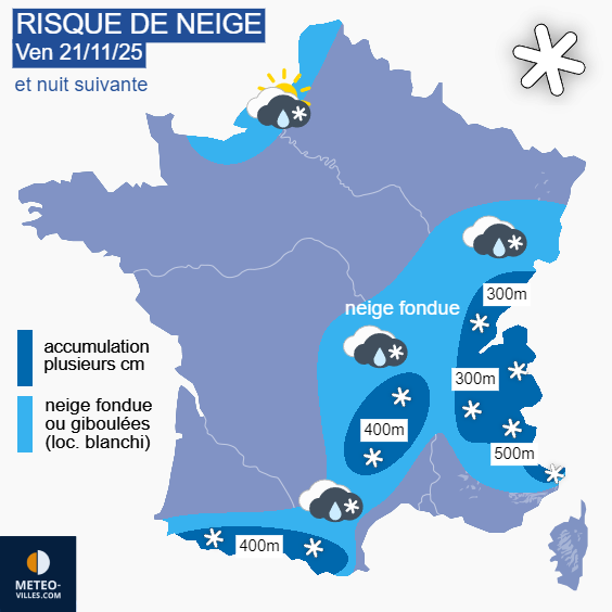 Vendredi 21 novembre, les précipitations concerneront notamment les reliefs de l’est avec des chutes de neige jusque dans les plus basses vallées du Jura et des Alpes. Elles donneront un petit manteau blanc, surtout au dessus de 300 mètres. En dessous, la neige sera fondante avec une température faiblement positive. Notons que d’importantes quantités de neige vont tomber sur les Pyrénées avec une limite pluie/neige s’abaissant jusqu’au pied du relief, vers 400 mètres seulement. Du Pas-de-Calais au Calvados, des giboulées pourront encore se produire.