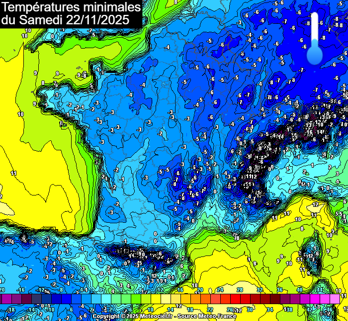 Températures minimales modélisées le samedi 22 novembre 2025 – meteociel.fr