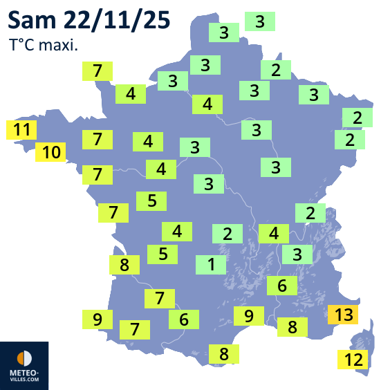 Températures maximales prévues le samedi 22 novembre 2025 – Météo Villes