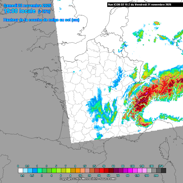 Évolution de l’épaisseur de neige au sol prévue par le modèle météo allemand icône entre samedi 19h et dimanche 16h – METEOCIEL