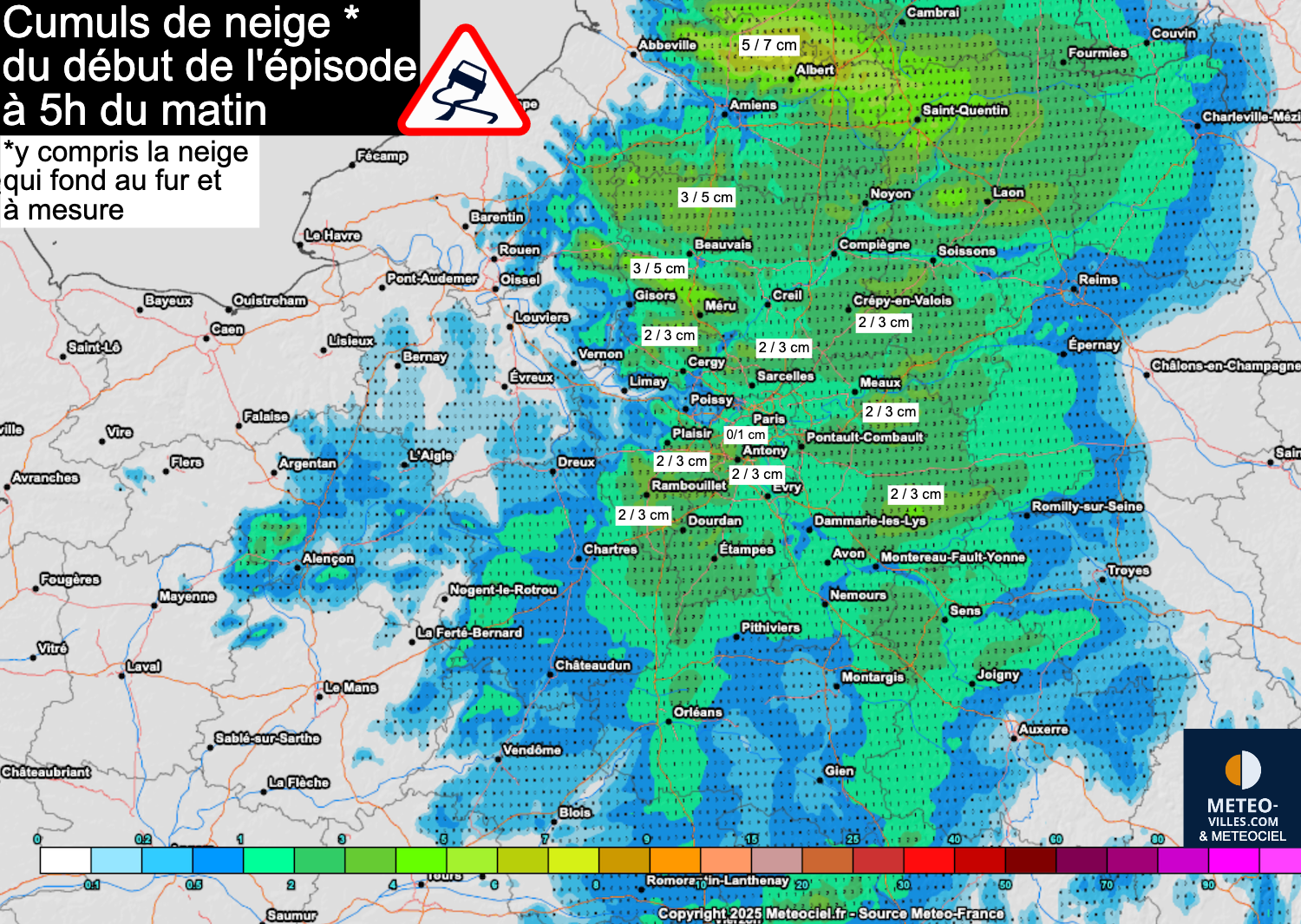 Après minuit et jusqu’en fin de nuit, les chutes de neige s’étendront à l’orléanais, à la Champagne, à une partie de la Bourgogne et au Massif central où des inversions de température pourraient entraîner des pluies verglaçantes.  De plus, il n’est pas exclu qu’un épisode de pluies verglaçantes touche également une partie des régions du nord-est, ainsi que la Bourgogne et éventuellement le Centre.