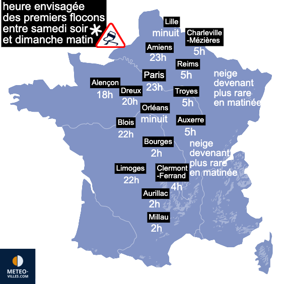 Le département de l’Orne sera probablement la première zone à connaître des chutes de neige samedi en début de soirée.  Par la suite, la zone de neige s’étendra progressivement à mesure que les précipitations progresseront dans l’air froid. Entre 20 heures et 22 heures, des chutes de neige sont prévues entre Dreux, Blois et Limoges. La neige aborderait ensuite l’Île-de-France et la Picardie par l’Ouest à partir de 22 heures