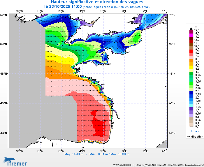 Hauteur de la houle sur l’Atlantique ce jeudi 23 octobre 2025 – Ifremer